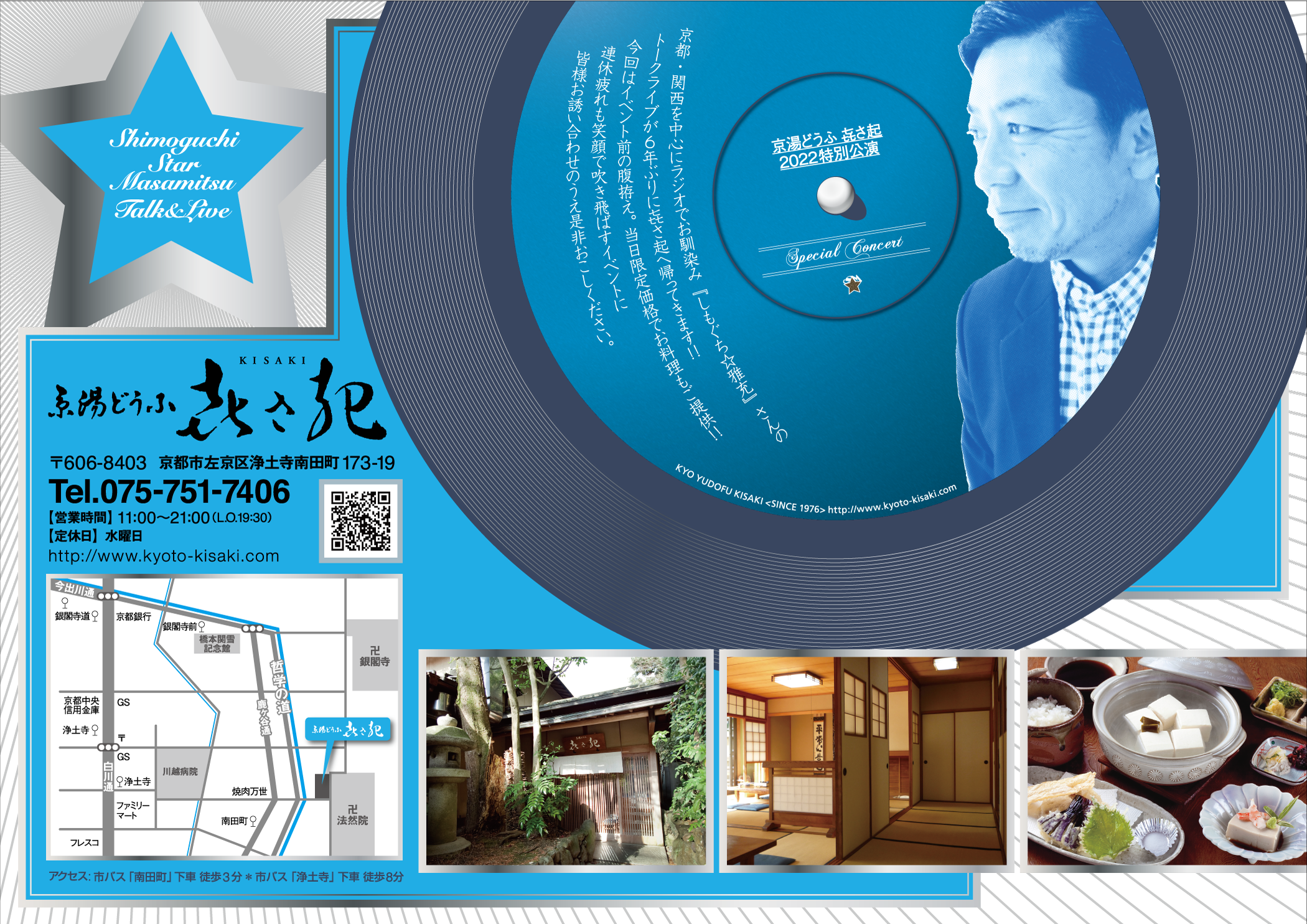 京都・関西を中心にラジオでお馴染み『しもぐち☆雅充』さんの三ツ星トークライブに、当日限りの特別なお料理をご用意しました。連休明けも笑って食べて、元気たっぷり!皆様お誘い合わせのうえ是非おこしください。